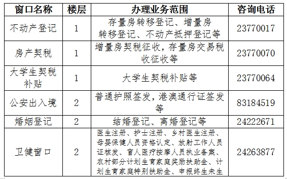 一樓:不動(dòng)產(chǎn)、契稅、公證處、人事檔案等窗口部門以及24小時(shí)自助廳等。