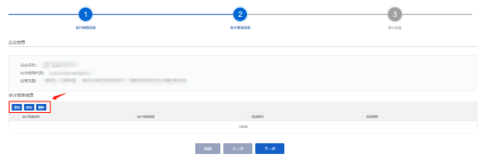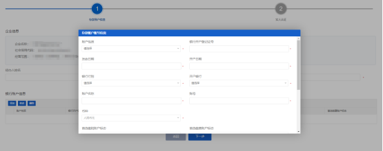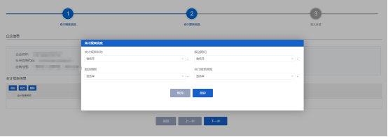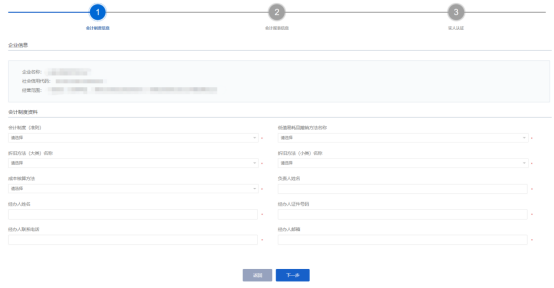 4、表單項(xiàng)上帶紅色*標(biāo)識(shí)的為必須填寫(xiě)的事項(xiàng)信息,申請(qǐng)人填寫(xiě)完成后,點(diǎn)擊【下一步】進(jìn)入到會(huì)計(jì)報(bào)表信息填報(bào)環(huán)節(jié)。如下圖: