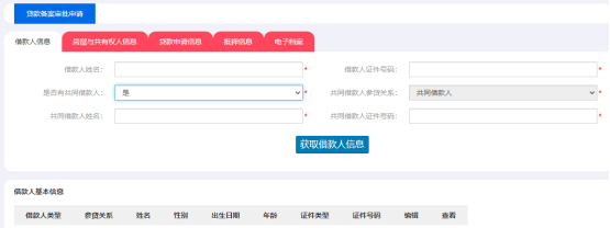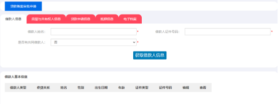 1、第一個(gè)頁(yè)簽【借款人信息】里,經(jīng)辦人需要根據(jù)借款人是否已婚錄入借款人信息頁(yè)簽的對(duì)應(yīng)信息,未婚的主借人錄入借款人姓名和證件號(hào)碼后點(diǎn)擊【獲取借款人信息】;已婚的主借人在【是否有共同借款人】選項(xiàng)處選擇是后錄入共同借款人姓名和證件號(hào)碼再點(diǎn)擊【獲取借款人信息】,下方列表會(huì)展示錄入的借款人信息
