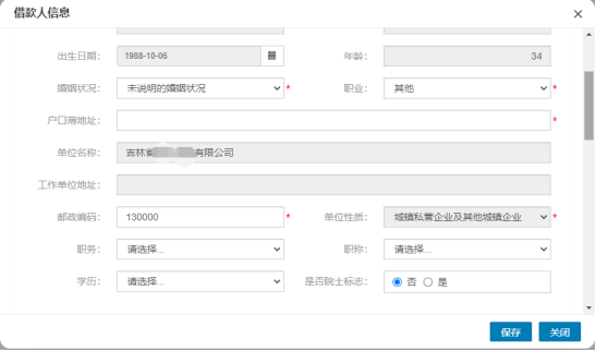 經(jīng)辦人需要補(bǔ)充借款人的必填信息如【婚姻狀況】、【職業(yè)】、【戶口簿地址】、【郵政編碼】、【單位性質(zhì)】、【月收入】、【手機(jī)號(hào)碼】、【家庭住址】等,其他非必填項(xiàng)按真實(shí)情況酌情錄入,信息編輯完畢后點(diǎn)擊【保存】即可(月收入為借款人的繳存基數(shù))