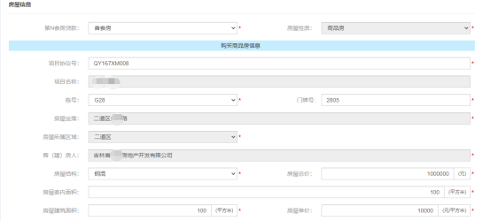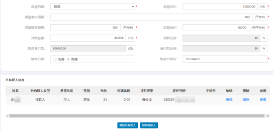 項(xiàng)目協(xié)議號(hào)錄入后自動(dòng)回顯該協(xié)議相關(guān)協(xié)議信息,經(jīng)辦人繼續(xù)補(bǔ)充房屋的其他信息如【棟號(hào)】、【門牌號(hào)】,填寫【房屋總價(jià)】、【房屋套內(nèi)面積】、【房屋建筑面積】、【貸款金額】、【購(gòu)房合同號(hào)】等必填字段,共有權(quán)人信息默認(rèn)自動(dòng)填充,可針對(duì)共有權(quán)人信息進(jìn)行【編輯】、【查看】、【刪除】