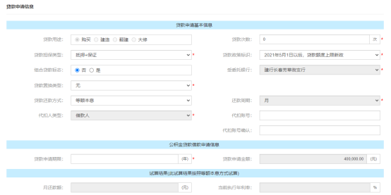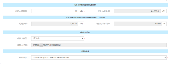 上方的貸款申請(qǐng)信息錄入后繼續(xù)在【貸款申請(qǐng)期限】處錄入申請(qǐng)年限,錄入后會(huì)在下方試算結(jié)果欄里顯示按照等額本息的還款方式試算出來的月還款額和執(zhí)行利率作為參考,【收款人】類型需要選擇開發(fā)商,選擇后收款人名稱自動(dòng)回顯為開發(fā)商名稱