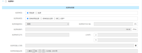 貸款申請(qǐng)信息錄入完畢后點(diǎn)擊左上角【抵押信息】頁(yè)簽補(bǔ)充抵押與保證信息,商品房期房類型的需要補(bǔ)充抵押與保證信息、現(xiàn)房類型需要補(bǔ)充抵押信息,點(diǎn)擊【增加抵押物】后默認(rèn)回顯抵押物即貸款房屋相關(guān)信息,相關(guān)信息均為回顯不需要改動(dòng)