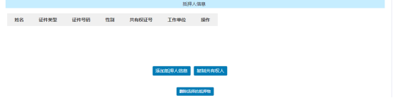 抵押物信息添加完畢后下方顯示抵押人信息欄,經(jīng)辦人需要維護(hù)相關(guān)抵押人,點(diǎn)擊【添加抵押人信息】在彈出的抵押人信息頁(yè)簽里手動(dòng)錄入相關(guān)信息;點(diǎn)擊【復(fù)制共有權(quán)人】自動(dòng)填充抵押人信息如下圖所示;若抵押物信息有誤可先勾選上方抵押物1方框再點(diǎn)擊【刪除選擇的抵押物】即可清空抵押物信息