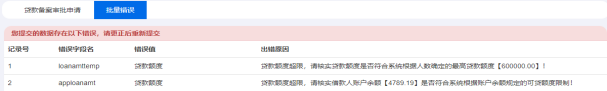 點(diǎn)擊任務(wù)號(hào)可重新回到暫存的頁(yè)面繼續(xù)補(bǔ)充信息;若借款人申請(qǐng)信息存在不符合要求的情況時(shí)左上角的批量錯(cuò)誤頁(yè)簽會(huì)顯示