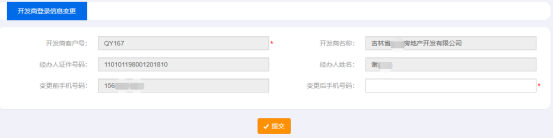 錄入新的手機(jī)號(hào)碼后點(diǎn)擊【提交】按鈕,即可實(shí)時(shí)變更該經(jīng)辦人的手機(jī)號(hào)碼,后續(xù)經(jīng)辦人登錄時(shí)使用新的手機(jī)號(hào)碼接收登錄驗(yàn)證碼