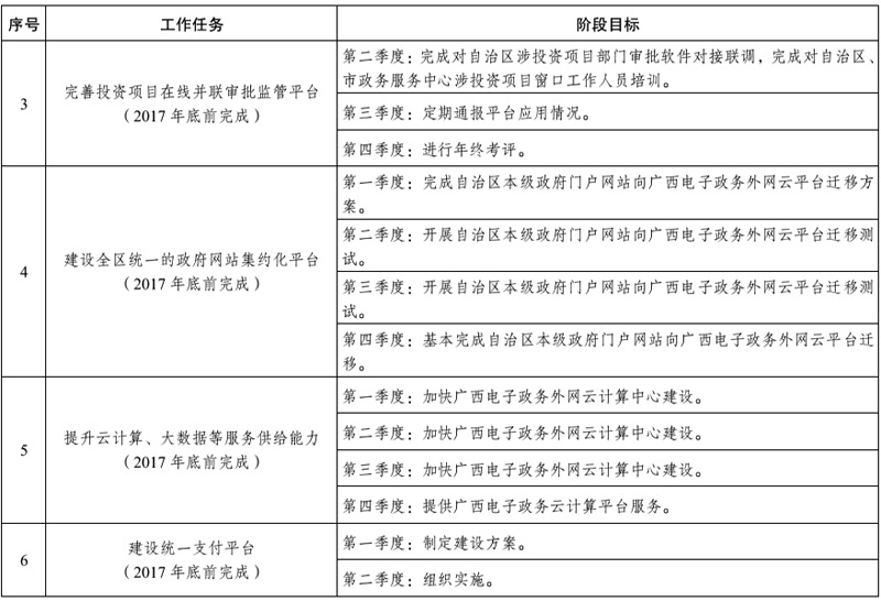 按照國家審定的廣西電子政務(wù)內(nèi)網(wǎng)建設(shè)方案,建設(shè)適合我區(qū)實(shí)際的電子政務(wù)內(nèi)網(wǎng)(政府部分),滿足全區(qū)各級(jí)各部門的工作需要,實(shí)現(xiàn)自治區(qū)、市、縣三級(jí)網(wǎng)絡(luò)縱向貫通、橫向互聯(lián)互通。(自治區(qū)政府辦公廳牽頭,各市縣政府配合;2018年底前完成)