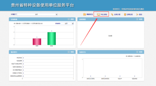 系統(tǒng)首頁以圖表的形式對設(shè)備數(shù)量、超期預(yù)警、整改提示、檢驗狀態(tài)進行統(tǒng)計分析;菜單欄包含:電梯保險、網(wǎng)上報檢、業(yè)務(wù)辦理、法律法規(guī),進行電梯檢測網(wǎng)上報檢請點擊“網(wǎng)上報檢”菜單。如下圖所示: