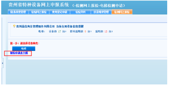 進入“網(wǎng)上報檢”詳情頁面后,請點擊菜單欄上的“檢測網(wǎng)上報檢”菜單進行電梯檢測申請和電梯檢測查詢。如下圖所示: