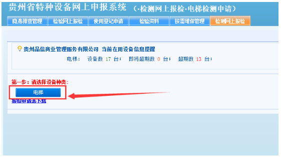 點擊“檢測網(wǎng)上”菜單默認展示“電梯檢測申請”的詳情頁面,頁面上展示當前在用電梯設(shè)備的數(shù)量、即將超期和超期的設(shè)備數(shù)量,點擊對應(yīng)的數(shù)字可查看詳細的設(shè)備列表明細;電梯檢測申請主要分為三步,分別為:選擇設(shè)備種類、選擇報檢設(shè)備、填寫報檢信息。如下圖所示: