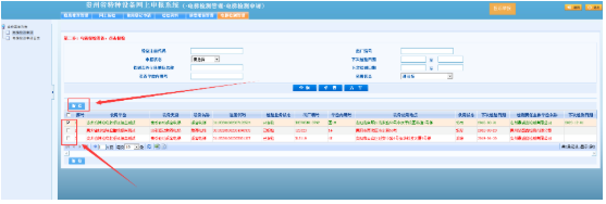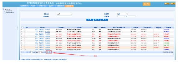 系統(tǒng)默認展示當前登錄用戶名下的所有設(shè)備,可使用頁面上方的查詢進行篩選,勾選需要報檢的設(shè)備點擊“報檢”按鈕即可進入下一步操作,支持選擇多臺設(shè)備一起報檢。如下圖所示: