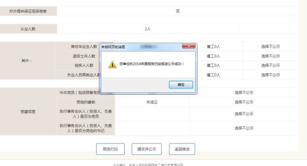 b、完成“提交并公示”,看到圖九的提醒內(nèi)容后,本次年報才算填報成功。