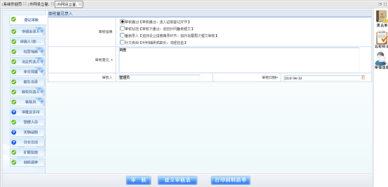 輸入審核意見,點擊【材料核審】,系統(tǒng)會彈出需設(shè)立終審的工作人員,提交給該人員后,該人員進行設(shè)立登記終審
