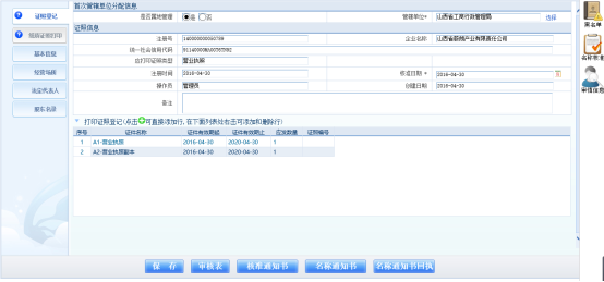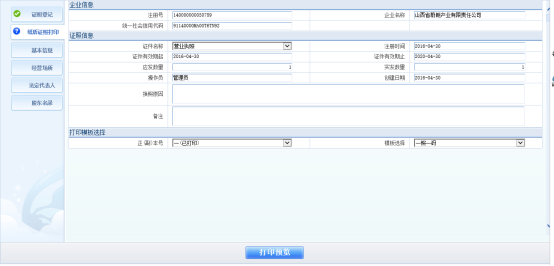 設(shè)立登記審核后,進入證照打印流程:點擊【保存】,系統(tǒng)進入紙質(zhì)證照打印界面