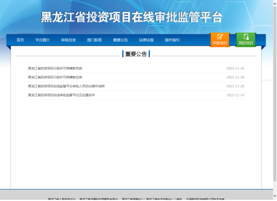 為進(jìn)一步深化行政審批體制改革,最大限度地方便廣大人民群眾和市場(chǎng)主體辦理固定資產(chǎn)投資項(xiàng)目審批事項(xiàng),經(jīng)黑龍江省人民政府批準(zhǔn),在互聯(lián)網(wǎng)建立黑龍江省投資項(xiàng)目在線審批監(jiān)管平臺(tái),向公眾提供投資項(xiàng)目聯(lián)合審批服務(wù)。