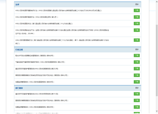 如想查看法律法規(guī),首頁(yè)點(diǎn)擊法律法規(guī)按鈕,進(jìn)入法律法規(guī)頁(yè)面,顯示法律、行政法規(guī)、部門規(guī)章前五項(xiàng)法規(guī),如想查詢?nèi)繂螕艉蠓礁?,?yè)面跳轉(zhuǎn)至顯示所有該項(xiàng)法律法規(guī)如圖34所示.