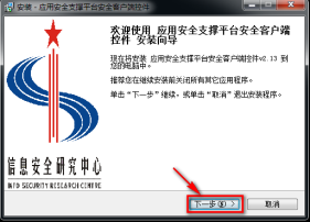 雙擊該運(yùn)行“電子簽章客戶端軟件“,首先安裝程序會(huì)彈出“應(yīng)用安全支撐平臺(tái)客戶端控件”的安裝提示,點(diǎn)擊“下一步”繼續(xù)安裝操作。