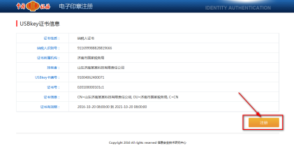 在同意使用協(xié)議后,系統(tǒng)會(huì)讀取UsbKey中信息,并展示到頁面上,請(qǐng)核對(duì)信息,確認(rèn)無誤后,點(diǎn)擊頁面中的“注冊(cè)”按鈕,開始注冊(cè)