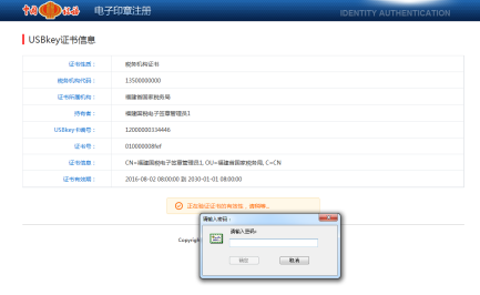 點(diǎn)擊“注冊(cè)“按鈕之后,系統(tǒng)會(huì)驗(yàn)證UsbKey中證書的有效性,處理相應(yīng)的證書數(shù)據(jù),并會(huì)自動(dòng)根據(jù),UsbKey中的證書證書信息自動(dòng)生成一枚電子印章,過程會(huì)持續(xù)20秒左右,請(qǐng)耐心等待,過程中會(huì)出現(xiàn)提示輸入UsbKey的口令,請(qǐng)輸入口令,以便系統(tǒng)可以繼續(xù)進(jìn)行相應(yīng)的處理。