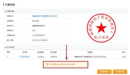 在系統(tǒng)處理完成數(shù)據(jù)之后,頁面會(huì)展示出電子印章的基本信息,并且有注冊(cè)完成的提示,如下圖所示: