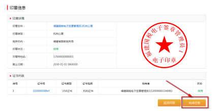注冊(cè)完成后,點(diǎn)擊頁面的“完成注冊(cè)”,結(jié)束印章注冊(cè)。