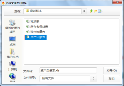(2)將對(duì)應(yīng)的企業(yè)原表上傳。此處對(duì)應(yīng)為“資產(chǎn)負(fù)債表”、“利潤(rùn)表”、“現(xiàn)金流量表”和“所有者權(quán)益變動(dòng)表”,如在資產(chǎn)負(fù)債表右側(cè)點(diǎn)擊“選擇文件”,彈出如圖3-2所示對(duì)話框: