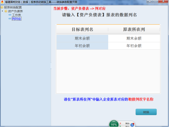1.問(wèn):報(bào)表自動(dòng)轉(zhuǎn)換時(shí),轉(zhuǎn)換參數(shù)配置頁(yè)面“列對(duì)應(yīng)”出現(xiàn)提示:當(dāng)前步驟:資產(chǎn)負(fù)債表——列對(duì)應(yīng),請(qǐng)輸入[資產(chǎn)負(fù)債表]報(bào)表的數(shù)據(jù)列名 出現(xiàn)“目標(biāo)表列名”和“原表所在列”表頭提示