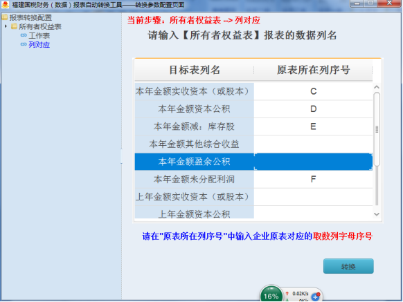 答:在轉(zhuǎn)換參數(shù)配置頁(yè)面,所有者權(quán)益表“目標(biāo)表列名”對(duì)應(yīng)“原表所在列”序號(hào)(即對(duì)應(yīng)列的英文字母),而不是原表所在列名稱,請(qǐng)返回修改。