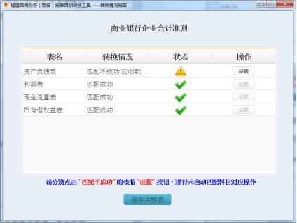 (2)再逐項(xiàng)核對(duì)對(duì)應(yīng)科目數(shù)字是否正確,存在差異的,請(qǐng)返回轉(zhuǎn)換情況報(bào)告頁(yè)面,點(diǎn)擊設(shè)置進(jìn)行具體科目匹配后,重新點(diǎn)擊“保存并轉(zhuǎn)換”直至報(bào)表正確。