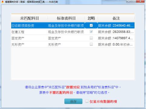“匹配不成功”科目設(shè)置。如圖3-10所示,未匹配科目有應(yīng)收賬款、固定資產(chǎn)和無(wú)形資產(chǎn),默認(rèn)狀態(tài)下都為忽略不轉(zhuǎn)換,其中無(wú)形資產(chǎn)的期末余額和年初余額為0,勾選右下角“僅顯示有數(shù)據(jù)的項(xiàng)”可以屏蔽數(shù)據(jù)都為0的科目。以應(yīng)收款項(xiàng)類投資配置為例,點(diǎn)擊標(biāo)準(zhǔn)表科目,選擇對(duì)應(yīng)的標(biāo)準(zhǔn)科目“其他資產(chǎn)”,即將企業(yè)表的“應(yīng)收款項(xiàng)類投資”科目數(shù)據(jù)添加到金三標(biāo)準(zhǔn)表的“其他資產(chǎn)”目錄下。依次對(duì)企業(yè)未匹配科目進(jìn)行設(shè)置,如未匹配科目數(shù)據(jù)不需要體現(xiàn)在金三標(biāo)準(zhǔn)表中,則保持忽略狀態(tài)即可。