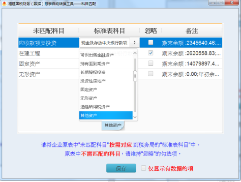 (1)匹配完原表中“固定資產(chǎn)凈額/凈值”出現(xiàn)“未匹配科目”問(wèn)題提示,請(qǐng)問(wèn)在標(biāo)準(zhǔn)表中如何配置?忽略和不忽略數(shù)據(jù)都不相等,三個(gè)與固定資產(chǎn)有關(guān)的標(biāo)準(zhǔn)科目都試了。