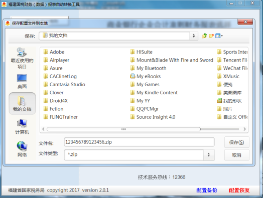 如圖3-14所示,納稅人可在右下角選擇藍(lán)色“配置備份”保存初始化完成后的配置文件到本地計(jì)算機(jī),工具將自動(dòng)生成一個(gè)以該納稅人納稅人識(shí)別號(hào)位名稱的加密zip文件。