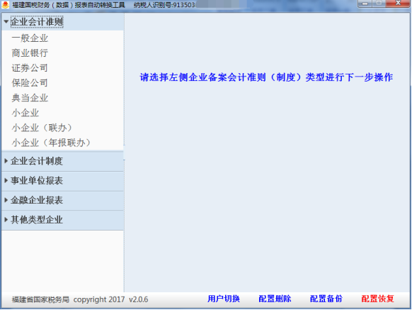 (1)轉(zhuǎn)換之前,需要先輸入納稅人識(shí)別號(hào),然后在“企業(yè)類型”(財(cái)務(wù)報(bào)表類型)選擇報(bào)表類型,不同企業(yè)類型的企業(yè)對(duì)應(yīng)的報(bào)表有所不同,這里以選擇“企業(yè)會(huì)計(jì)準(zhǔn)則(一般企業(yè))財(cái)務(wù)報(bào)表報(bào)送與信息采集”為例,選完后界面如圖3-1所示。