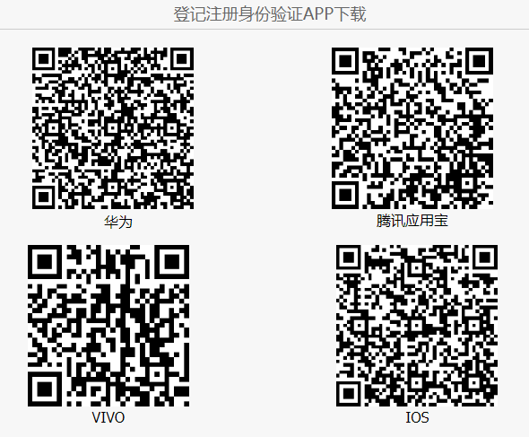 本系統(tǒng)自2019年6月24日起,更新了實(shí)名認(rèn)證功能。以自然人身份辦理用戶注冊(cè)、企業(yè)名稱申報(bào)時(shí),代理人和投資人均需通過(guò)“登記注冊(cè)身份驗(yàn)證”APP進(jìn)行用戶實(shí)名注冊(cè)并同意辦理企業(yè)登記注冊(cè)及有效期設(shè)置后,再進(jìn)行操作。身份驗(yàn)證APP下載請(qǐng)前往華為應(yīng)用市場(chǎng)、騰訊應(yīng)用寶、VIVO應(yīng)用市場(chǎng)和蘋(píng)果應(yīng)用商店下載,也可以掃描二維碼下載。