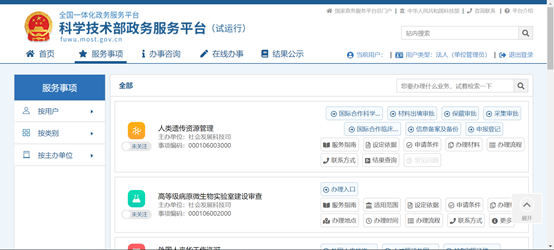 服務(wù)事項(xiàng)主要為用戶提供業(yè)務(wù)辦理服務(wù),用戶可以在此欄目查詢辦理政務(wù)服務(wù)平臺(tái)所集成的所有信息系統(tǒng),為了方便用戶的使用,用戶可以按用戶、按類別、按主辦單位進(jìn)行分類查詢。按用戶分為自然人和法人單位;按類別分為行政許可、科技計(jì)劃與經(jīng)費(fèi)、科技創(chuàng)新服務(wù)、其他四類;按主辦單位包括辦公廳、資源配置與管理司、社會(huì)發(fā)展科技司、引進(jìn)國(guó)外智力管理司、國(guó)家科學(xué)技術(shù)獎(jiǎng)勵(lì)工作辦公室、科技部火炬高技術(shù)產(chǎn)業(yè)開(kāi)發(fā)中心、國(guó)家科技風(fēng)險(xiǎn)開(kāi)發(fā)事業(yè)中心、國(guó)家自然科學(xué)基金委員會(huì)和中國(guó)人類遺傳資源管理辦公室;