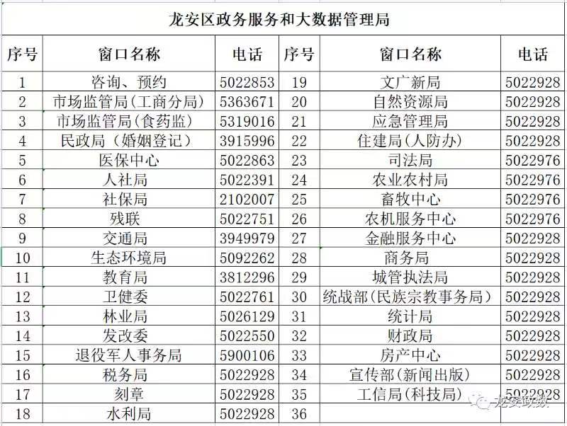 龍安區(qū)行政便民服務(wù)中心電話:3932339,工作時間:周一至周五 上午:09:00-11:50 下午:13:00-17:00,龍安區(qū)太行小區(qū)街道辦事處便民服務(wù)中心電話:3696110,工作時間:周一至周五 上午:08:30-12:00 下午:14:30-17:30