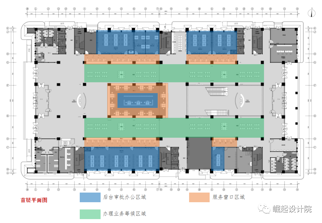 基于“以公共服務(wù)為中心”的設(shè)計理念,項目設(shè)計中對各樓層的平面進行了優(yōu)化。首層建筑面積3882平方米,設(shè)置有60個對外窗口,增設(shè)了導(dǎo)辦臺、全彩大屏、填單區(qū)、便民服務(wù)區(qū)、自助辦理區(qū)、銀行等多功能區(qū)域,減少窗口人員工作量,優(yōu)化窗口功能,讓嘈雜不堪的政務(wù)大廳變得井然有序,提高整體辦事效率。