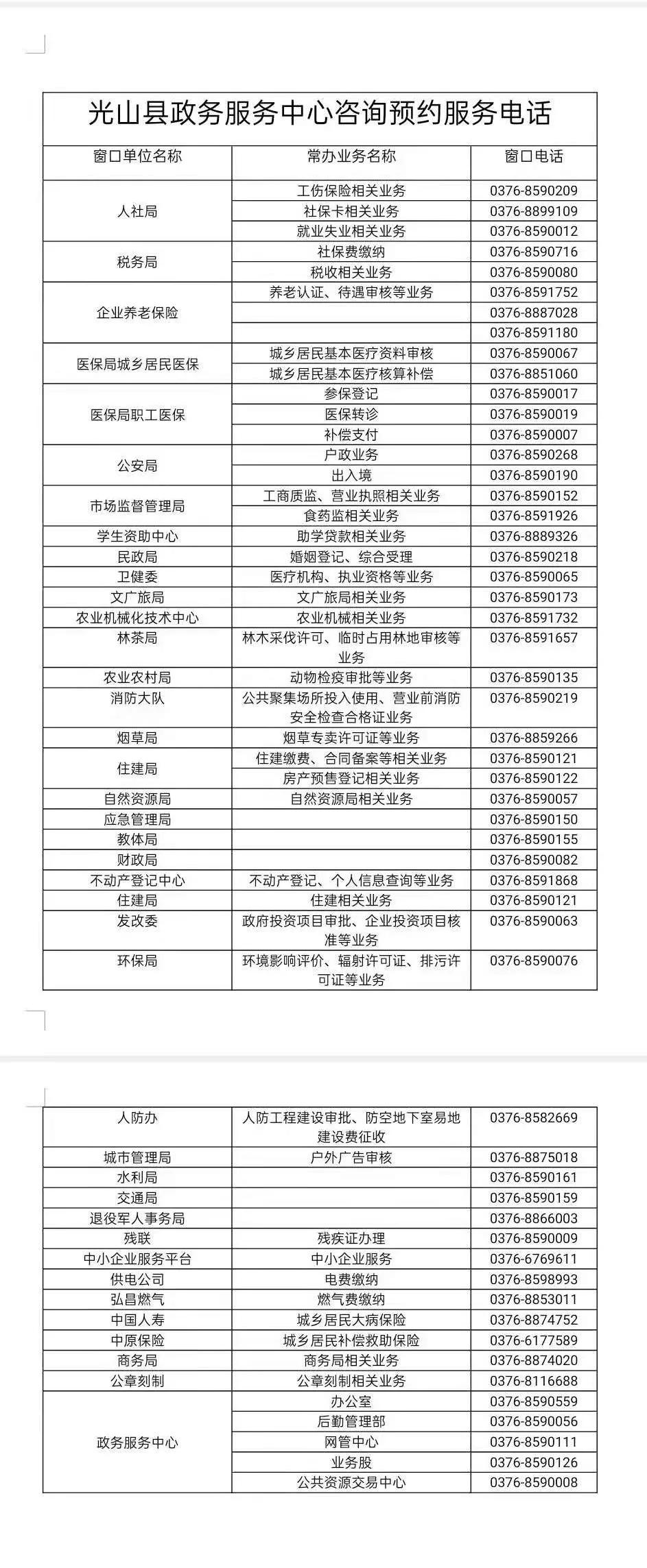 光山縣政務服務中心電話:03768590165;工作時間:周一至周五 上午:09:00-12:00 下午:13:00-17:00;光山縣弦山街道辦事處黨政便民服務中心電話:03768876031