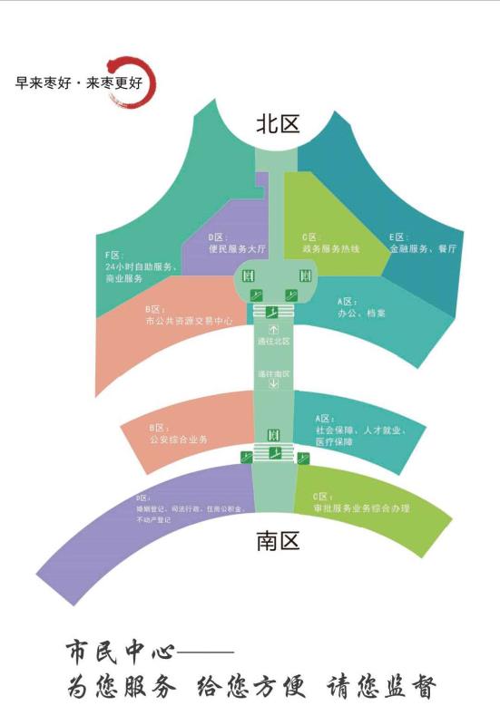 棗莊市民中心位于棗莊新城中軸線文體中心區(qū)域內(nèi),緊鄰體育場北部,總建筑面積4.6萬平方米,分為南北兩個區(qū),通過石榴花(棗莊市花)造型連為一體。南區(qū)作為政務(wù)服務(wù)主體大廳,建筑面積1.3萬平方米,將原分散在市區(qū)的市政務(wù)服務(wù)中心、市公安車輛管理中心(不含車輛檢測事項)、市社會保險管理服務(wù)中心、市住房公積金管理中心、市不動產(chǎn)登記中心等集中入駐到市民中心。按照辦事便捷、關(guān)聯(lián)性強、便于辨認的原則設(shè)置4大分區(qū)。一層?xùn)|區(qū)(A區(qū))為社保、醫(yī)保、婚姻登記專區(qū),一層西區(qū)(B區(qū))為公安綜合專區(qū),二層?xùn)|區(qū)(C區(qū))為市審批服務(wù)局專區(qū),二層西區(qū)(D區(qū))為司法、稅務(wù)、公積金、不動產(chǎn)專區(qū)。4大分區(qū)已進駐單位涵蓋了近600余項行政審批及公共服務(wù)事項,讓廣大市民真正體驗到一站式的政務(wù)服務(wù)。