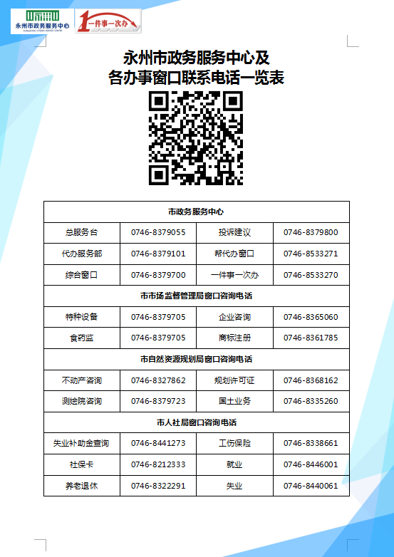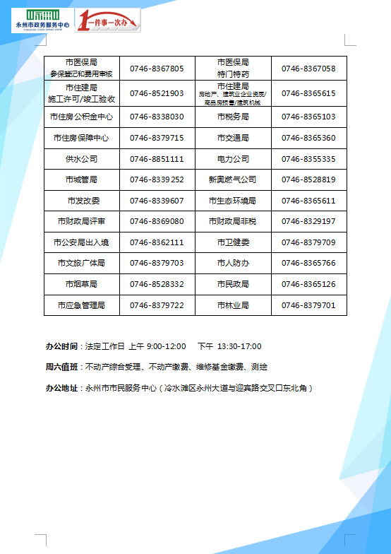 永州市政務(wù)服務(wù)中心地址:湖南省永州市永州大道與迎賓大道交匯處東北角市民服務(wù)中心,聯(lián)系電話:0746-8521903,寶貴時間:法定工作日:上午9:00—12:00,下午13:30—17:00