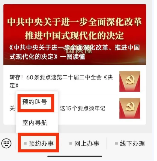 第一步:微信搜索關注“雞西政務服務中心”公眾號,點擊菜單欄中“預約辦事”,選擇“預約叫號”板塊。