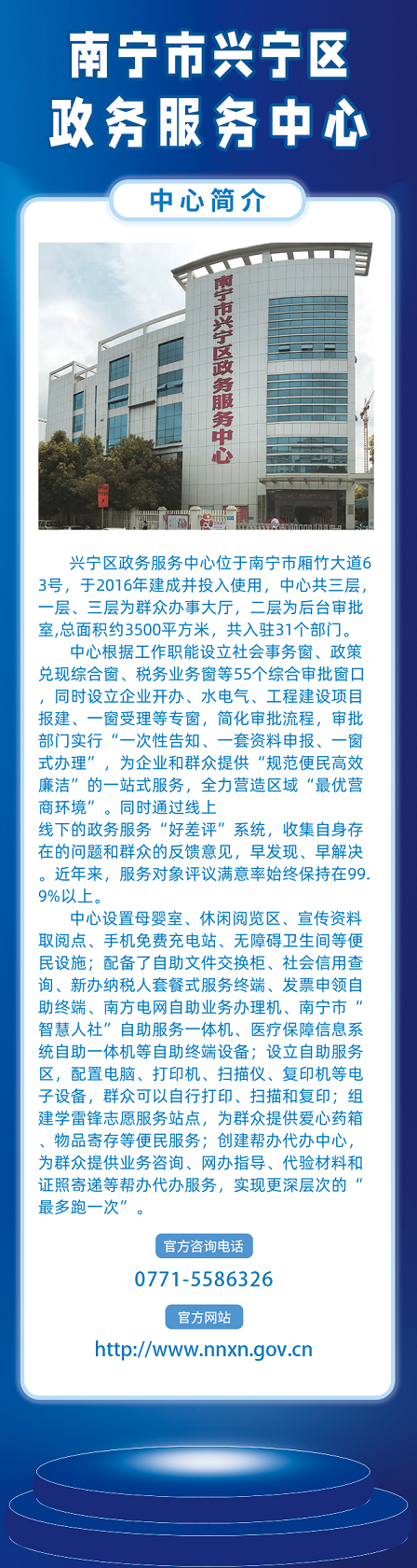 南寧市興寧區(qū)政務服務中心以“便民、高效、公開、公正”為宗旨,以“部門圍著窗口轉、窗口圍著群眾轉”為原則,以服務城區(qū)經濟發(fā)展為核心,以人民群眾滿意為標準,進一步簡化審批程序,提高行政效率,為群眾提供方便快捷、優(yōu)質高效的服務。