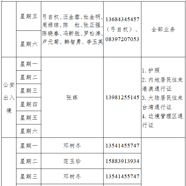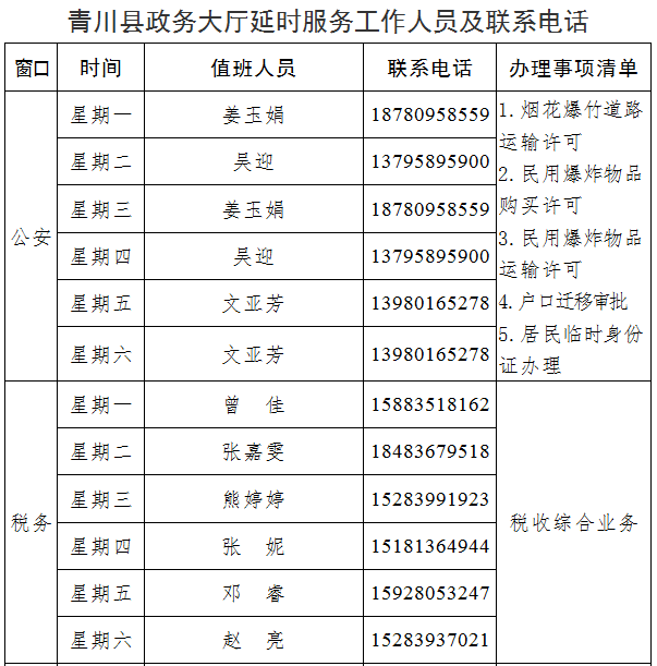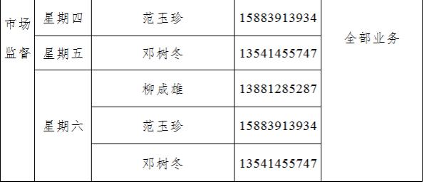 星期六上午9:00-11:30實行預約延時服務,為預約對象提供正常服務。企業(yè)和群眾提前一個工作日進行預約,預約方式為電話預約、現(xiàn)場預約。(受理預約人、電話、事項詳見附件)
