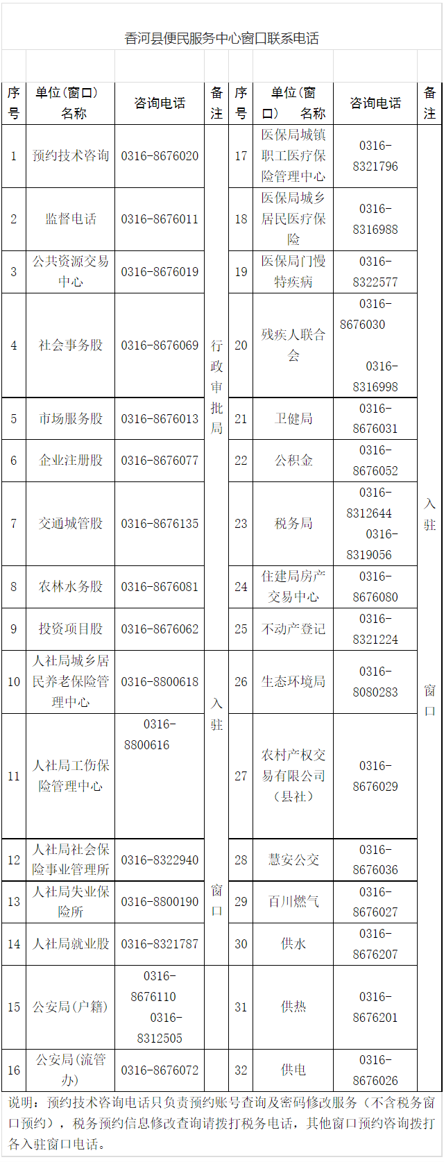 香河縣便民服務(wù)中心辦事大廳窗口聯(lián)系電話;預(yù)約技術(shù)咨詢電話:0316-8676020;企業(yè)注冊股咨詢電話:0316-8676077