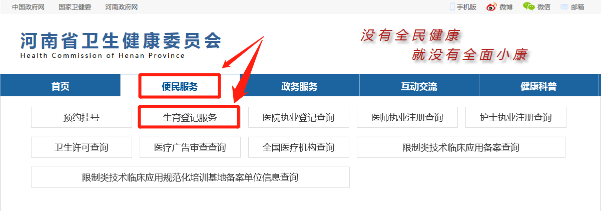 申請人直接登錄河南省衛(wèi)生健康委員會官網(wǎng),首頁“便民服務(wù)”一欄選擇“生育登記服務(wù)”,再根據(jù)頁面指引進行辦理
