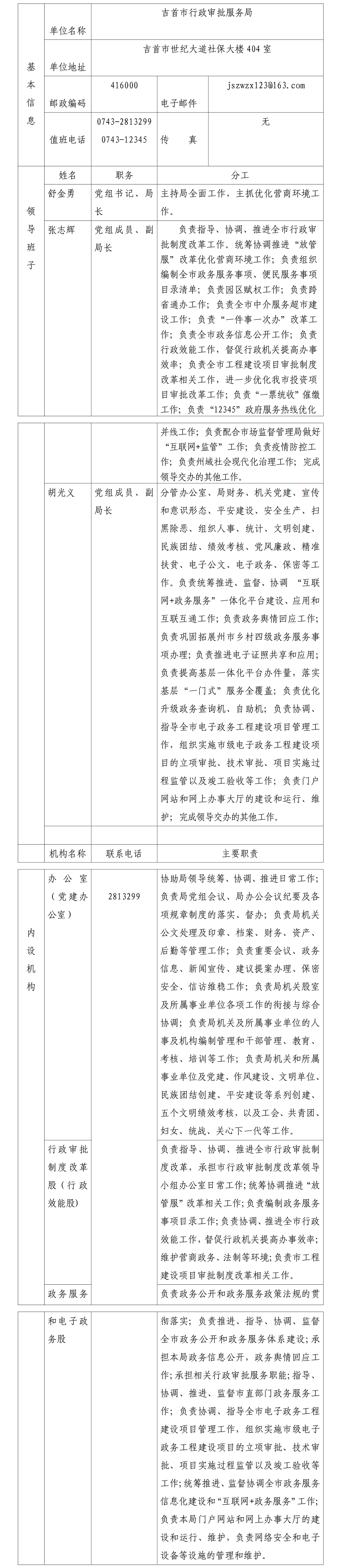 內設機構設置 吉首市行政審批服務局內設科室3個,分別為:辦公室、行政審 批制度改革股、政務服務和電子政務股。