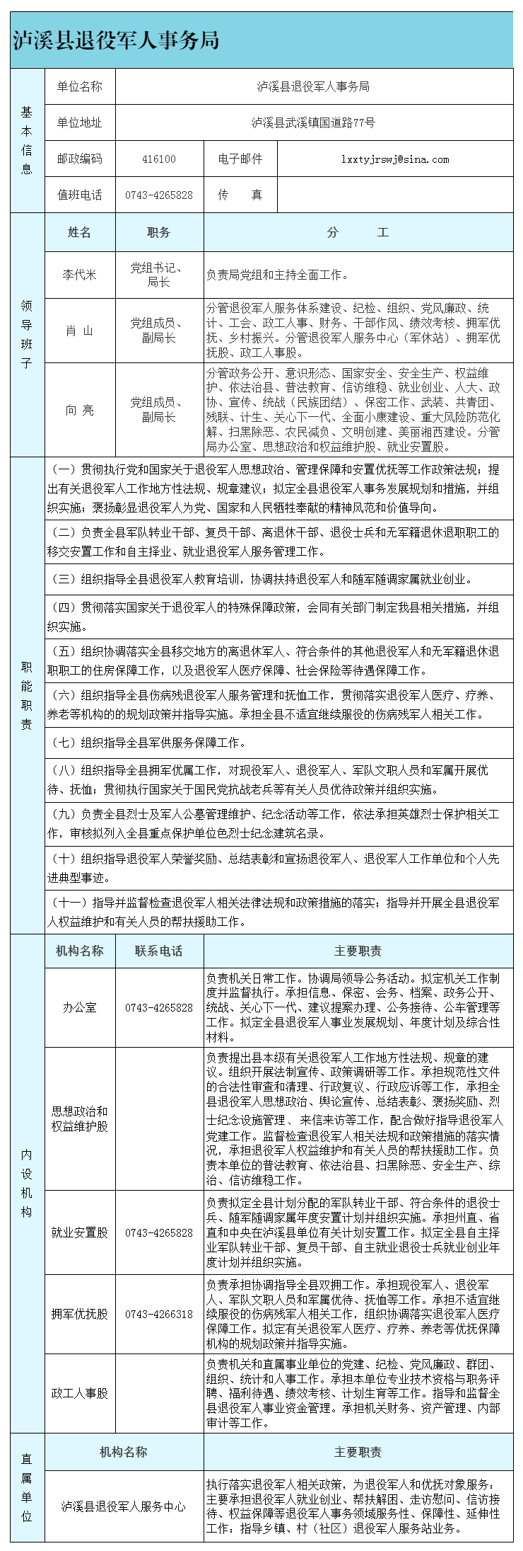 瀘溪縣退役軍人事務局內(nèi)設機構5個分別為:1、辦公室2、思想政治和權益維護股3、就業(yè)安置股4、擁軍優(yōu)撫股5、政工人事股。