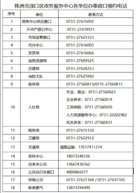 株洲市淥口區(qū)政務(wù)服務(wù)中心各單位辦事窗口預(yù)約電話;政務(wù)中心綜合窗口咨詢電話:0731-27615092;公安窗口咨詢電話:0731-27621778;不動(dòng)產(chǎn)登記中心咨詢電話:0731-27618931;市場(chǎng)監(jiān)管窗口咨詢電話:0731-27623333
