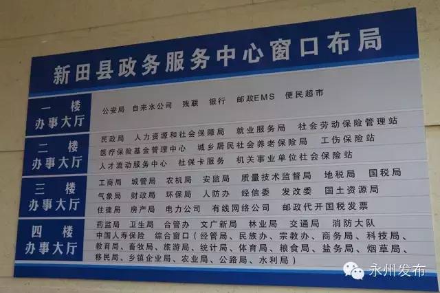 新田縣政務服務中心分四層,第一層安排公安、殘聯(lián)、自來水三個部門辦理業(yè)務,二層是安排就業(yè)服務局、機關社保站、社會保險站、失業(yè)保險站等一些人社部門的一些窗口和民政局的婚姻登記、老年人事務的辦理,三層是房地產(chǎn)一體化、安監(jiān)、國稅、地稅、有線電視等等部門,四層是綜合窗口、發(fā)改委、衛(wèi)生局、合管辦等等部門。