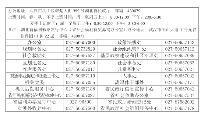 湖北省民政廳辦公室地 址: 武漢市洪山區(qū)雄楚大街399號(hào)聯(lián)系方式:027-50657000負(fù)責(zé)機(jī)關(guān)日常運(yùn)轉(zhuǎn),承擔(dān)機(jī)關(guān)文電、會(huì)務(wù)、督查、信息、機(jī)要、保密、檔案、信訪、安全、政務(wù)公開、新聞宣傳等工作。
